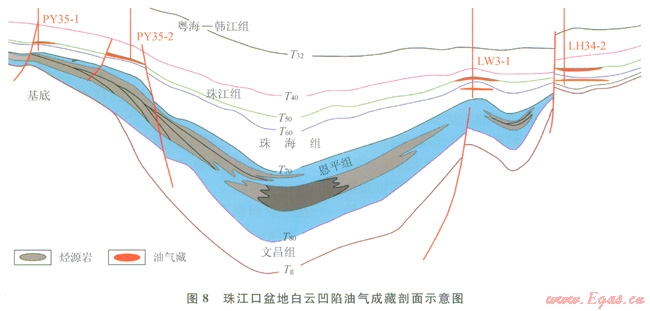 珠江口盆地位于南海北部大陸邊緣東段,白云凹陷位于珠江口盆地南部坳陷帶珠二坳陷內(nèi),凹陷基底是燕山期島弧帶,凹陷內(nèi)新生代地層發(fā)育。白云凹陷演化歷經(jīng)了古近紀(jì)裂陷期,早、中中新世坳陷期和晚中新世以來(lái)的新構(gòu)造期[20]。白云凹陷發(fā)育始新統(tǒng)文昌組中深湖相泥巖、下漸新統(tǒng)恩平組海陸過(guò)渡相煤系地層與海灣相泥巖、上漸新統(tǒng)珠海組海相泥巖共計(jì)3套烴源巖(圖8)。恩平組海陸過(guò)渡相煤系地層海灣相泥巖是主力烴源巖,其中暗色泥巖總有機(jī)碳含量介于1.0%~l.5%,展布規(guī)模大,烴源巖母質(zhì)類型多為偏腐殖混合型及腐殖型。恩平組煤系烴源巖主要發(fā)育在凹陷北部斜坡區(qū)域,展布范圍超過(guò)5000km2,煤層發(fā)育,在PY33-1-1井恩平組有煤20層,累計(jì)厚度為22.98m[18]。文昌組中深湖相烴源巖有機(jī)碳含量介于0.50%~4.88%,平均為1.22%,以偏腐泥混合型十酪根為主。白云凹陷位于洋陸過(guò)渡區(qū),地溫梯度及大地?zé)崃髦捣謩e高達(dá)4.5℃/100m和77.5mW/m2[15],屬于超熱盆。白云凹陷恩平組底部烴源巖現(xiàn)今成熟度在凹陷中心部位R。為0.5%~2.0%,主凹最深處尺。達(dá)到2.0%,在凹陷邊緣部位R。介于0.5%~0.7%;有機(jī)質(zhì)熱演化多處在成熟~高熟凝析油及生氣階段,其烴類產(chǎn)物以大量天然氣及少量輕質(zhì)油及凝析油為主;主洼以生氣為主,周邊的衛(wèi)星洼陷埋藏淺,以生油為主。此外,文昌組烴源巖在白云凹陷斜坡帶現(xiàn)今R。為2.1%,表明文昌組烴源巖也已經(jīng)達(dá)到生氣階段。白云凹陷及其鄰區(qū)發(fā)育漸新統(tǒng)儲(chǔ)蓋組合和新近系儲(chǔ)蓋組合,油氣勘探都有重要發(fā)現(xiàn);目前的油氣勘探發(fā)現(xiàn)多在珠江組;預(yù)測(cè)主力儲(chǔ)蓋組合為恩平組與珠海組。
