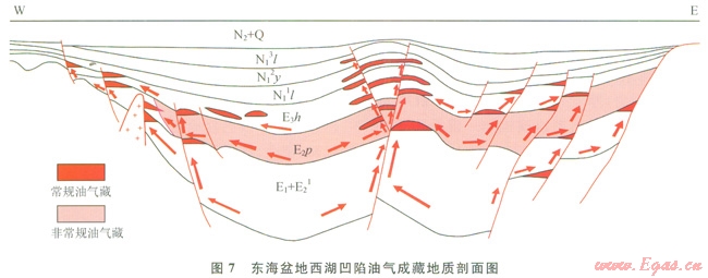 東海盆地位于東海陸架區(qū),基底是燕山期陸緣花崗巖帶,新生代歷經(jīng)裂陷期、坳陷期及新構(gòu)造期3大構(gòu)造階段。其中裂陷期為古新世—始新世,坳陷期為漸新世—中新世,上新世—第四紀(jì)為新構(gòu)造期。東海盆地以新生代沉積地層為主,從古新統(tǒng)至第四系均有發(fā)育。該盆地經(jīng)歷了5次主要構(gòu)造改造作用,特別顯著的是發(fā)生過(guò)多期正反轉(zhuǎn)(圖6、7)。東海貧地呈二坳二隆構(gòu)造格局。西部坳陷帶(長(zhǎng)江坳陷、臺(tái)北坳陷)、中央隆起帶(虎皮礁隆起、海礁隆起、漁山東隆起)、東部坳陷帶(福江凹陷、西湖凹陷、釣北凹陷)和東部隆起帶(釣魚島隆褶帶,即陸架外緣隆起)。東海盆地形成于太平洋板塊俯沖導(dǎo)致的弧后擴(kuò)張作用;隨著俯沖帶的不斷東撤,盆地內(nèi)部呈由西向東逐漸變新的構(gòu)造遷移特征,沉積—沉降中心逐漸東移,形成了凹陷之間構(gòu)造—沉積演化的差異。古新世裂陷主要發(fā)生在東海盆地的西部坳陷帶,始新世—漸新世裂陷主要發(fā)生在其東部坳陷帶。