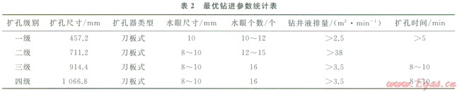 3)加大鉆井液排量,改進(jìn)水眼配置,提高水眼射速。擴(kuò)孔水力參數(shù)對比情況見表1。