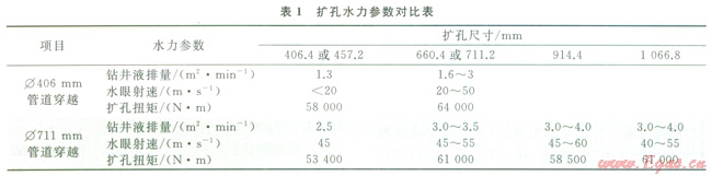 Æ406mm管道穿越擴(kuò)孔施工時發(fā)現(xiàn)鉆井液排量低于2m2/min、水眼射速低于50m/s時擴(kuò)孔扭矩大,鉆具磨損快。Æ711mm管道穿越擴(kuò)孔施工時調(diào)整了施工參數(shù),改進(jìn)了擴(kuò)孔器選型,使得擴(kuò)孔扭矩得到了有效控制,鉆屑及時排除,水力切削充分,鉆具幾乎沒有磨損,加快了施工進(jìn)度,保證了每次擴(kuò)孔一次性成功。根據(jù)3次管道穿越對鉆進(jìn)參數(shù)的調(diào)整情況,并結(jié)合現(xiàn)場實(shí)際可以達(dá)到的施工條件,最優(yōu)的鉆進(jìn)參數(shù)統(tǒng)計(jì)結(jié)果見表2。