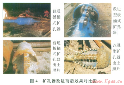 2)采用改進(jìn)型板桶式擴(kuò)孔器,提高了擴(kuò)孔效率,降低了施工風(fēng)險(圖4)。采用新擴(kuò)孔器后,在Æ711mm-B管道穿越四級擴(kuò)孔施工中均是一次性完成了擴(kuò)孔,出土后的擴(kuò)孔器磨損很小,擴(kuò)孔效果極好。根據(jù)B管的擴(kuò)孔經(jīng)驗(yàn),在改進(jìn)擴(kuò)孔器切割方式的前提下,Æ711mm-A線進(jìn)一步優(yōu)化了擴(kuò)孔器水嘴的配置,使得鉆井液有效輔助切削,減小了擴(kuò)孔扭矩,將原來的四級擴(kuò)孔減少到三級(660.4mm、914.4mm、l066.8mm),提高了施工效率,節(jié)約了工期。