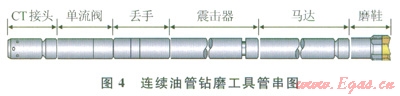 連續(xù)油管鉆磨橋塞工具管串為:卡瓦接頭+馬達頭總成+震擊器+馬達+磨鞋。其中馬達和磨鞋是其中的關鍵部分,直接影響了工具的使用壽命和鉆磨橋塞的效率(圖4)。