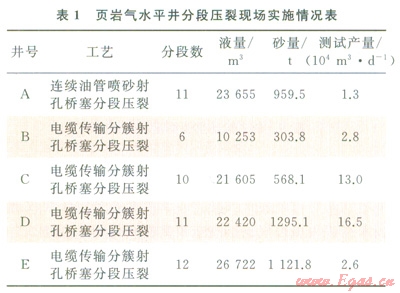 自主技術先后在四川油氣田長寧威遠國家級頁巖氣示范區(qū)進行了5口水平井的分段壓裂改造實踐。從應用情況看,所有技術或工具能夠滿足頁巖氣水平井分段壓裂的需求,應用效果良好(表1)。