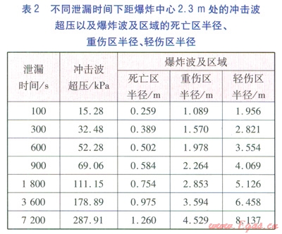 取環(huán)形縫隙泄漏流量為7.882×10-4m3/s規(guī)格為l5mm的燃氣管道[8],泄漏時間分別取l00、300、600、900、1800、3600、7200s。例:2.3m處Dp=52.28kPa,Dp=44kPa處>2.3m。沖擊波、爆炸波及區(qū)域破壞半徑采用不同方法計算,前者采用式(3)、(4)計算,后者采用式(5)~(7)計算。不同泄漏時間下距爆炸中心2.3m處(內(nèi)墻位置)的沖擊波超壓以及爆炸波及區(qū)域的死亡區(qū)半徑、重傷區(qū)半徑、輕傷區(qū)半徑見表2。