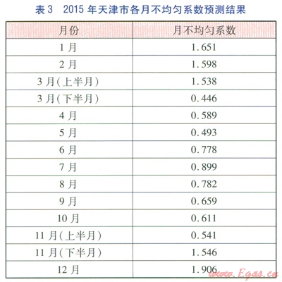 2015年天津市各類用戶天然氣用量預(yù)測結(jié)果見表2。由表2可知,2015年最大用氣量將達(dá)到164.02×108m3,并作為計(jì)算2015年季節(jié)調(diào)峰儲氣量的基礎(chǔ)數(shù)據(jù)。2015年天津市各月不均勻系數(shù)預(yù)測結(jié)果見表3,由于3月15日、ll月15日分別為供暖期結(jié)束和供暖期開始時(shí)間,因此這兩個(gè)月的上下半月不均勻系數(shù)變化較大。
