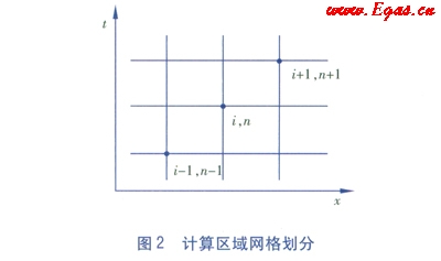 采用Crank-Nicolson格式對(duì)上式進(jìn)行離散可得(計(jì)算區(qū)域網(wǎng)絡(luò)劃分見圖2):