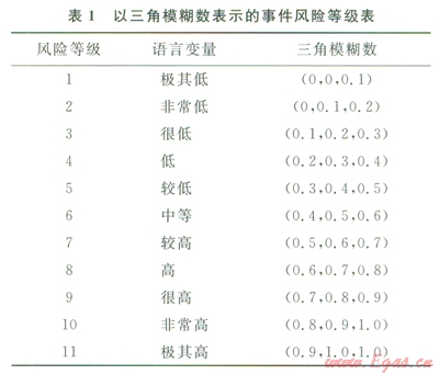 將引起燃?xì)夤艿佬孤┦录L(fēng)險(xiǎn)分為11個(gè)等級[8],相應(yīng)的語言變量及模糊數(shù)參照表l,語言變量可直觀表達(dá)風(fēng)險(xiǎn)因素的相對重要性。