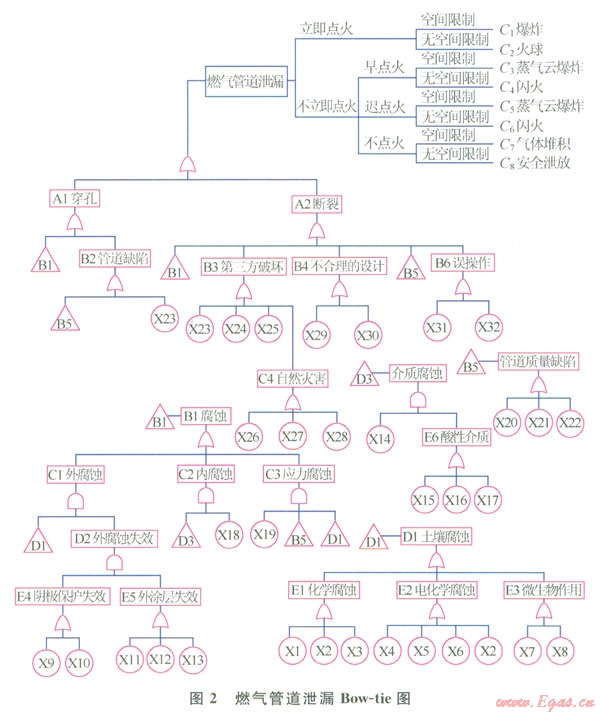 城市燃?xì)夤艿赖娘L(fēng)險(xiǎn)取決于管道失效的可能性和事故后果的嚴(yán)重性[3],為將燃?xì)夤艿朗鹿实那耙蚝蠊Y(jié)合起來進(jìn)行風(fēng)險(xiǎn)評價(jià),首次引入Bow-tie模型,將風(fēng)險(xiǎn)分析中的故障樹和事件樹聯(lián)系起來。Bow-tie模型最早出現(xiàn)在澳大利亞昆士蘭大學(xué)關(guān)于帝國化學(xué),工業(yè)公司危害分析的課程講義[4],隨后殼牌公司將其應(yīng)用于阿爾法鉆井平臺爆炸災(zāi)難分析中[5],至今這一技術(shù)已被廣泛應(yīng)用到一些重大事故。