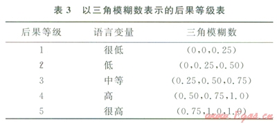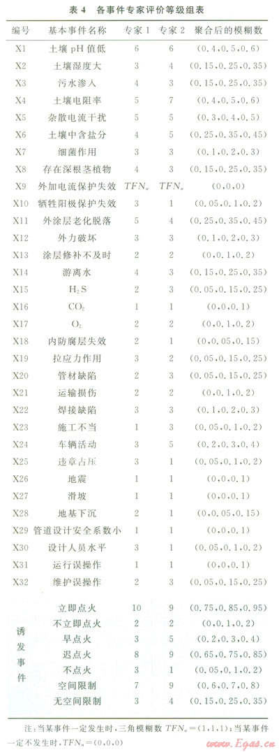首先邀請有經(jīng)驗(yàn)的專家組成評價(jià)小組,冉對專家進(jìn)行權(quán)重分析,本文僅以兩位專家為例,并且賦予其相等的權(quán)重。依據(jù)故障樹中基本事件和事件樹中誘發(fā)事件的風(fēng)險(xiǎn)大小,由號家賦予每個(gè)事件相應(yīng)的三角模糊數(shù),評價(jià)結(jié)果見表4,然后根據(jù)式(5)求得聚合后的事件模糊數(shù)。