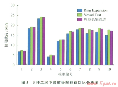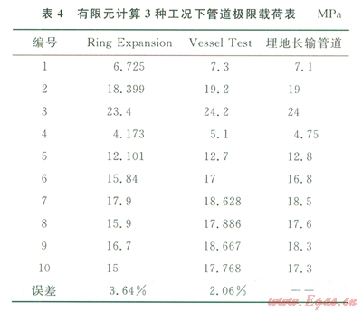 基于已確定的適合高強度管道的失效判據(jù),采用有限元分析方法模擬3種工況下管道的失效情況。圖5對3種情況下計算出的極限載荷做了對比分析。表4為3種丁況下管道極限載荷的對比值,通過對比分析可看出:加封頭的爆破試驗與埋地管道的預(yù)測極限載荷吻合度更高,l0組誤差的標準偏差值為2.06%;兩端密封的爆破試驗比埋地管道的預(yù)測極限載荷要小,l0組誤差的標準偏差值為3.64%。在實際工程試驗中,建議用加封頭的爆破試驗來預(yù)測埋地管道的極限載荷;用兩端密封的爆破試驗來預(yù)測真實埋地管道的失效情況,得到的預(yù)測結(jié)果偏保守。