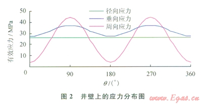 根據(jù)上面的分析可知,當(dāng)鉆井液密度過(guò)大時(shí),在q=0°和q=180°處井壁最容易發(fā)生破裂,該處井壁上的有效應(yīng)力為:
