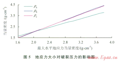 圖7為3種破裂壓力隨孔隙壓力的變化規(guī)律,計(jì)算時(shí)保持構(gòu)造應(yīng)力系數(shù)不變,只改變孔隙壓力的大小。當(dāng)?shù)貙涌紫秹毫Ξ?dāng)量密度由l.0g/cm3 上升到2.0g/cm3時(shí),3種破裂壓力都近似呈線性增大,但rc增長(zhǎng)速率遠(yuǎn)小于ra和rb;當(dāng)孔隙壓力當(dāng)量密度小于1.5g/cm3時(shí),井壁首先發(fā)生A型剪切破裂;當(dāng)孔隙壓力當(dāng)量密度大于1.5g/cm3時(shí),首先發(fā)生拉伸破裂,即孔隙壓力越大發(fā)生拉伸破裂的可能性越大。