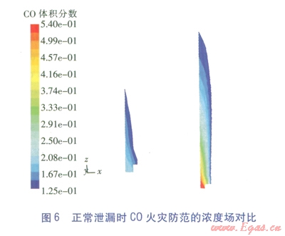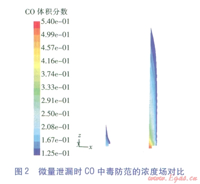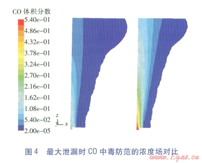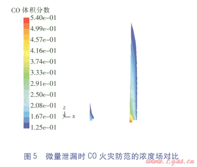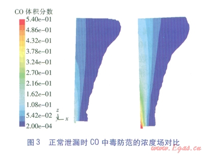 值得一提的是,火災防范時只將爆炸極限列為危害區(qū)間,這符合不發(fā)生明火時的氣體冷態(tài)擴散情況,但一旦發(fā)生燃燒,C0的濃度場將發(fā)生極大變化,還將產生對人員窒息的煙氣。FLUENT作為一款功能強大的軟件,也能模擬燃燒情況(俗稱熱態(tài)研究),但這將大大增加參數(shù)設定的復雜性和計算過程冗時性,這是工程計算力求避免的,但應是理論研究的改進方向。