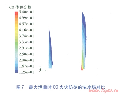 C0是CRG的主要叮燃組分,在12.5%~74.0%的爆炸極限范圍內均可燃,且其密度與空氣相近,泄漏后較難快速散失,會混入地面空氣中產生橫向蔓延,因此研究考慮的C0防火控制體積分數(shù)取其爆炸下限l2.5%,即低于該含量均屬安全。
