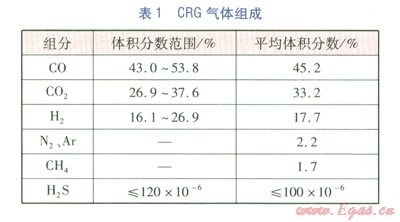 CRG是在COREX非高爐煉鐵反應時產生的氣體,屬于人工煤氣,沒計輸送壓力為0.2 MPa,標準狀態(tài)下的低熱值為8.231MJ/m3,其一氧化碳含量較高,氣體組成見表1。