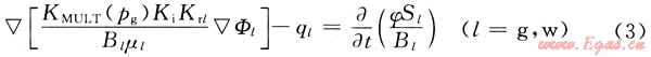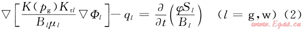 在滲流力學(xué)基礎(chǔ)上,從推廣的達西定律和黑油模型出發(fā)建立了三維氣、水兩相流考慮應(yīng)力敏感的非線性滲流數(shù)學(xué)模型[3~4],即