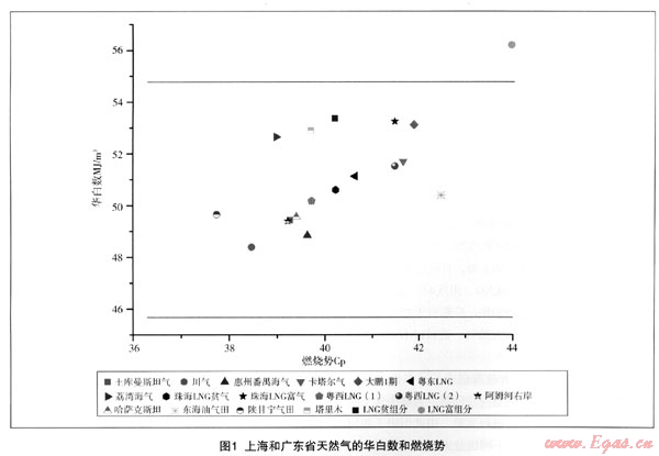 圖1列出了上海與廣東省一些氣源的華白數(shù)和燃燒勢,其整體變化并不大,除LNG富組分外均落在國標12T范圍之內(nèi)(華白數(shù)45.67~54.78MJ/m3,燃燒勢36.3~69.3,圖1中兩條直線中間的范圍即為國標中12T的華白數(shù)范圍。)。其中最貧的是川氣,最富的是珠海LNG富氣(表1)。若按照95%的CH4純度來配制川氣和珠海LNG(富),即單一氣體CH4含有95%的CH4和5%的C2H6,則配制的川氣和珠海LNG(富)之華白數(shù)將增加,分別為49.22和53.93,偏差為1.73%和1.3%。顯然,若考察不同來源天然氣的組分不同所導致的燃氣具性能變化,1.73%和1.3%的偏差無法滿足實驗要求,必須采用精確的配氣方法。