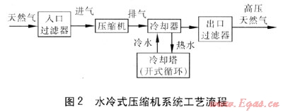 天然氣從入口過濾器進(jìn)入壓縮機,增壓后的氣體進(jìn)入換熱器列管中,與列管外的冷水進(jìn)行換熱,冷水把氣體放出的熱量吸收并帶走至風(fēng)冷卻器,冷卻系統(tǒng)完全封閉,循環(huán)水在冷熱交換時不和環(huán)境空氣接觸,熱水被風(fēng)冷卻器風(fēng)扇強制冷卻,降溫后的冷卻水通過水泵循環(huán)至換熱器。高壓天然氣被冷卻后,通過出口過濾器,流進(jìn)下一步工序。