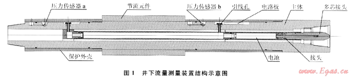 該測量裝置內(nèi)置壓力傳感器和數(shù)據(jù)采集卡,并通過多芯接頭與隨鉆測井(MWD)裝置連接??蓪崟r采集壓力傳感器的信號并進(jìn)行簡單處理,之后把采集的壓力數(shù)據(jù)通過MWD傳至地面進(jìn)行分析,即可得到井底實時的環(huán)空流速(流量)。