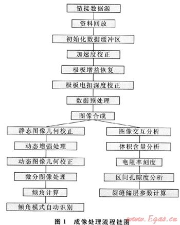 GeoReveal成像處理軟件在開發(fā)的過程中,針對國內(nèi)主流成像測井儀的設(shè)計原理、儀器結(jié)構(gòu)及測井方式,完成了成像資料預(yù)處理、圖像合成、圖像動態(tài)增強以及圖像繪制等一系列功能模塊。形成了一套功能強大、運行穩(wěn)定的成像測井資料解釋處理系統(tǒng)。系統(tǒng)采用鏈式管理結(jié)構(gòu)(圖1),提供給用戶方便、靈活的、交互性強的人機界面。