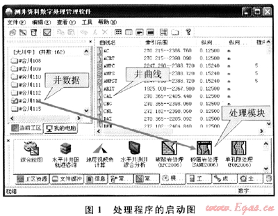 處理程序在設(shè)計時,應(yīng)用了Windows系統(tǒng)的拖放功能實現(xiàn)對數(shù)據(jù)的調(diào)度,只要將井?dāng)?shù)據(jù)拖到相應(yīng)處理模塊圖標(biāo)上,則可應(yīng)用該模塊進行處理(圖1)。