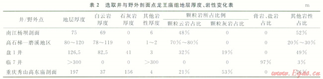 從選取的井并結(jié)合野外剖面點(diǎn)的巖性組合、變化情況等可以看出(表2),除去臨7井為膏鹽沉積外,龍王廟組沉積自西向東隨著水深的變化,整體厚度變大,顆粒灘沉積厚度也變大,沉積巖性的變化是由全部的白云巖沉積到開始出現(xiàn)石灰?guī)r沉積,最后到石灰?guī)r占整個(gè)龍王廟組的大部分,只有上部存在少量的白云巖的一個(gè)漸變過(guò)程。高石梯 磨溪地區(qū)是白云巖灘最發(fā)育的地區(qū),秀山高東廟剖面代表的中緩坡區(qū)域沉積的灘體多為石灰?guī)r灘。