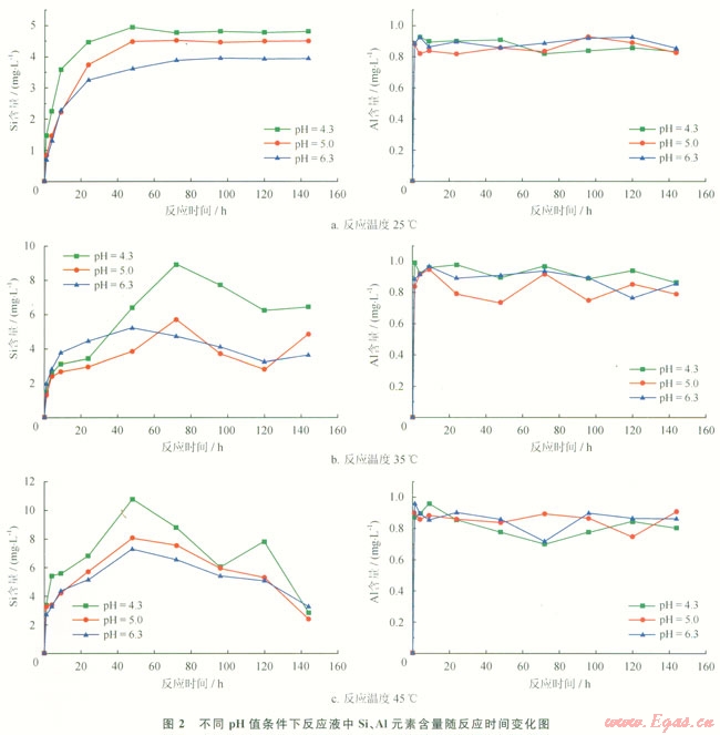 1)反應(yīng)溫度不同時,反應(yīng)溫度越高,Si元素的溶出量越大;隨溫度升高,Al元素的溶出量變化不大。溶液pH值和溫度相同時,隨反應(yīng)時間增加,反應(yīng)液中Si元素含量先增加后減小,有一定的振蕩。溫度為45℃時,反應(yīng)中si元素含量在48h時左右達到最大值,溫度為35℃時,反應(yīng)液中Si元素含量在72h左右達到最大值,溫度為25℃時,Si元素含量在96 h左右達到最大值;Al元素含量隨反應(yīng)時間增加迅速增加,并趨于穩(wěn)定。