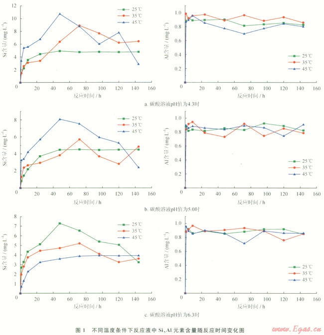 不同溫度、不同碳酸溶液pH值條件下,伊利石與碳酸溶液反應(yīng)不同時間后,反應(yīng)液中Si、Al元素濃度變化測試結(jié)果見圖l、2??梢钥闯?,伊利石中的Si、Al元素在碳酸溶液中的溶出具有以下特征。
