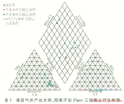 如圖3所示,不同地區(qū)煤層氣井產出水陰、陽離子在Piper三線圖上的分布較離散。北部地區(qū)煤層氣井產出水以K+、Na+、Cl-和HCO3-為主,Ca2+、Mg2+含量較低,SO42-含量極少,與地表水離子組成差異較大,說明該區(qū)遠離補給區(qū);而東南部地區(qū)煤層氣井產出水K+、Na+、Cl-含量較北部低,Ca2+、Mg2+含量略高于北部地區(qū)、SO42+含量較北部地區(qū)高,與地表水相似程度較高,說明該區(qū)靠近補給區(qū)。另外,該區(qū)產出水呈弱堿性,pH值介于7.1~8.3,平均值為7.8,不同地區(qū)差異較小。