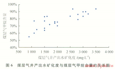 該區(qū)含氣量與礦化度呈正相關關系(圖2),東南部地層水礦化度小于1200mg/L的區(qū)域煤層含氣量一般小于2m3/t,而北部地層水礦化度大于1700mg/L的區(qū)域煤層含氣量一般大于4m3/t。同時,煤層氣井產出水礦化度與煤層甲烷含量之間相關性較好(圖6),煤層甲烷含量隨礦化度增加而增加,東南部煤層氣井產出水礦化度低于1200mg/L的地區(qū),煤層甲烷含量一般低于70%,而北部煤層氣井產出水礦化度高于1700mg/L,煤層甲烷含量一般大于80%。說明東南部距離補給區(qū)較近,地下水活躍,不利于煤層氣的保存,而北部遠離水源補給區(qū),水動力處于弱徑流區(qū)一滯留區(qū),保存條件好。另外,總體上北部煤層氣井產氣效果也明顯好于東南部,也說明北部煤層氣富集條件優(yōu)于東南部。