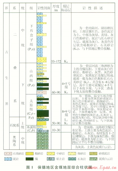 保德地區(qū)行政區(qū)劃位于山西省西北部,構造上位于鄂爾多斯盆地東緣晉西撓曲帶北段,總體上表現為向西傾的單斜構造,地層傾角介于5°~l0°,斷裂構造不甚發(fā)育[1],含煤地層為上石炭統一下二疊統太原組和下二疊統山西組(圖1)。區(qū)內發(fā)育煤層15~16層,山西組4+5號煤層和太原組8+9號煤層為主要煤層。其中,4+5號煤層單層厚度介于5~14.6m,平均為7.6m;8+9號煤層單層厚度介于5~14.2m,平均為l0.2m。