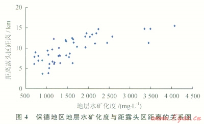 該區(qū)煤層氣井產出水礦化度總體較低,介于842~5072mg/L,平均為1750mg/L,總體變化趨勢由東向西、由南向北礦化度增加(圖2)。由于該區(qū)構造為西傾單斜,地下水總體流向為由東向西,隨著距離露頭區(qū)距離的增加,地層水礦化度增高(圖4)。北部開發(fā)區(qū)距離補給區(qū)較遠,而南部距離補給區(qū)較近,因此,南部地層水礦化度小于北部,水動力條件南部較北部活躍。