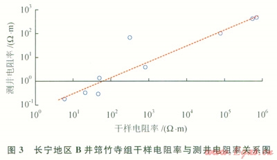 筆者將長(zhǎng)寧B井筇竹寺組9個(gè)樣品點(diǎn)的井下測(cè)井電阻率與干樣電阻率進(jìn)行對(duì)比發(fā)現(xiàn),樣品點(diǎn)的測(cè)井電阻率為0.177~457.93W·m,較干樣電阻率整體低2~4個(gè)數(shù)量級(jí)(表1),但與后者具有顯著的正相關(guān)性,測(cè)井電阻率在2W·m以下則對(duì)應(yīng)的干樣電阻率小于100W·m(圖3)。另外,9個(gè)樣品點(diǎn)的測(cè)井電阻率與TOC同樣具有顯著的負(fù)相關(guān)性,在1860.96~1886.40m(富有機(jī)質(zhì)頁巖段)呈現(xiàn)超低電阻特征(電阻率介于0.177~1.347W·m)(表1)。這表明,長(zhǎng)寧筇竹寺組井下導(dǎo)電物質(zhì)主要為有機(jī)質(zhì)和頁巖孔縫中地層水,其中擁有高礦化度的地層水是導(dǎo)致測(cè)井電阻率整體低于干樣電阻率的重要介質(zhì)。由于筇竹寺組下段為深水陸棚沉積,地層水物理化學(xué)性質(zhì)在整個(gè)層段總體穩(wěn)定,而有機(jī)質(zhì)豐度差異較大,僅在底部高伽馬段(192~615 API)較高,這表明長(zhǎng)寧筇竹寺組底部出現(xiàn)的異常低電阻測(cè)井響應(yīng)則主要是碳化后的有機(jī)質(zhì)導(dǎo)電所致??梢?,利用極高成熟度、富有機(jī)質(zhì)頁巖的超低電阻測(cè)井響應(yīng)特征(電阻率小于2W·m)和干巖樣低電阻特征(電阻率小于100W·m),均可以直觀判斷有機(jī)質(zhì)的碳化程度,進(jìn)而評(píng)價(jià)烴源巖的質(zhì)量。