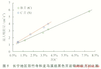 筆者從長(zhǎng)寧B井筇竹寺組和C井龍馬溪組分別采集超低電阻頁巖樣品4個(gè)(測(cè)井電阻率介于0.11~1.50W·m,TOC介于1.68%~7.93%)和中高電阻率頁巖樣品5個(gè)(測(cè)井電阻率介于22.6~45.9W·m,TOC介于0.99%~3.95%),并委托中國石油勘探開發(fā)研究院廊坊分院開展高溫高壓等溫吸附實(shí)驗(yàn)。實(shí)驗(yàn)儀器為ISO300型等溫吸附儀,設(shè)置實(shí)驗(yàn)溫度70℃、最大壓力20.22MPa、氣體介質(zhì)為甲烷,保證溫壓條件與井下基本相當(dāng)。實(shí)驗(yàn)結(jié)果顯示:2套地層頁巖樣品的最大吸附量分別為龍馬溪組1.38~3.97m3/t、筇竹寺組1.61~5.8m3/t,與TOC均呈線性正相關(guān)性(圖5);在有機(jī)質(zhì)類型相似(兩者均為腐泥偏腐泥混合型)和有機(jī)質(zhì)豐度(TOC)相同條件下,龍馬溪組中高電阻頁巖的吸附能力明顯高于筇竹寺組超低電阻頁巖,前者為后者的1.2~1.25倍。這表明,在高過成熟階段,隨著有機(jī)質(zhì)碳化程度的增強(qiáng),富有機(jī)質(zhì)頁巖對(duì)天然氣的吸附能力降低。