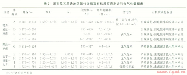 目前,與長(zhǎng)寧B井具有相似電性特征的鉆井還有位于隆昌—瀘州、長(zhǎng)寧—鎮(zhèn)雄—大方地區(qū)的G、B、H、1、J等5口井(表2、圖l),富有機(jī)質(zhì)頁巖測(cè)井電阻率介于0.1~2.0W·m,平均為0.5~0.8W·m,鉆探均未獲氣,均顯示有機(jī)質(zhì)出現(xiàn)嚴(yán)重碳化現(xiàn)象。