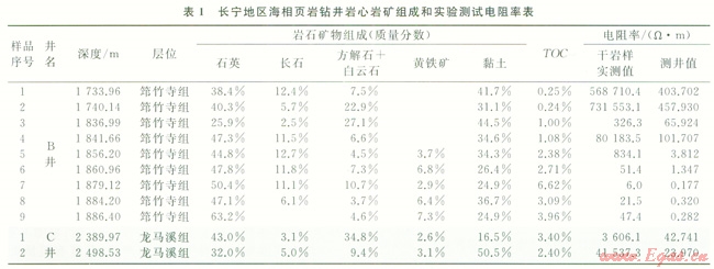 筆者以川南長(zhǎng)寧地區(qū)筇竹寺組、龍馬溪組黑色頁巖為研究對(duì)象,在B井筇竹寺組、C井龍馬溪組分別挑選有機(jī)質(zhì)豐度不同的頁巖樣品開展干樣電阻率實(shí)驗(yàn)測(cè)試(前者9個(gè),后者2個(gè))。實(shí)驗(yàn)過程如下:首先對(duì)樣品進(jìn)行干燥處理,去除所有頁巖樣品的基質(zhì)孔隙殘留水,然后分別測(cè)量十樣電阻率、巖礦和TOC。實(shí)驗(yàn)測(cè)試結(jié)果顯示(表1、圖2),2套頁巖的干樣呈現(xiàn)出截然不同的電性特征。