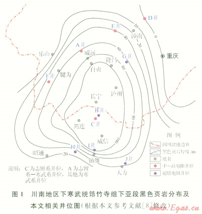 對(duì)筇竹寺組的勘探和研究程度遠(yuǎn)不及龍馬溪組,所鉆的頁巖氣評(píng)價(jià)井僅4口(編號(hào)A、B、H、I),主要分布在川滇的威遠(yuǎn)、長(zhǎng)寧和鎮(zhèn)雄地區(qū),其他揭示寒武系頁巖的鉆井(編號(hào)D、E、F、G、J)皆為常規(guī)油氣勘探評(píng)價(jià)井(圖1)。鑒于烴源巖碳化呵能導(dǎo)致電測(cè)曲線出現(xiàn)低—超低電阻響應(yīng)特征,筆者以筇竹寺組頁巖鉆井巖心、測(cè)井和分析測(cè)試資料為基礎(chǔ),通過對(duì)富有機(jī)質(zhì)頁巖干樣開展電阻率實(shí)驗(yàn)測(cè)試以獲得有機(jī)質(zhì)碳化的直接證據(jù),并以此對(duì)井下電阻率測(cè)井?dāng)?shù)據(jù)進(jìn)行標(biāo)定,進(jìn)而利用測(cè)井電阻率響應(yīng)對(duì)川南不同地區(qū)筇竹寺組的有機(jī)質(zhì)碳化現(xiàn)象進(jìn)行表征;同時(shí)結(jié)合與龍馬溪組電性、巖相、地球化學(xué)、吸附能力等相關(guān)資料的對(duì)比分析,探討不同程度的有機(jī)質(zhì)碳化現(xiàn)象對(duì)頁巖氣賦存條件的影響,以探尋極高成熟度海相頁巖氣地質(zhì)評(píng)價(jià)的新途徑,并據(jù)此為筇竹寺組頁巖氣資源戰(zhàn)略選區(qū)提供地質(zhì)依據(jù)。