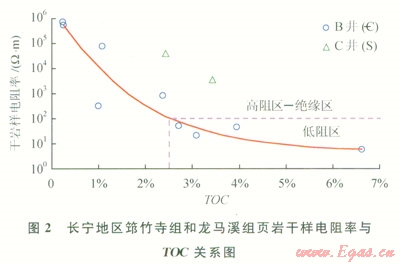 富有機(jī)質(zhì)頁巖為硅質(zhì)頁巖、碳質(zhì)頁巖和粉砂質(zhì)頁巖組合,與龍馬溪組在巖相、巖石礦物組成和有機(jī)質(zhì)豐度等方面相近[8,18,21],因此兩者的電性特征應(yīng)該具有可對(duì)比性,且能反映有機(jī)質(zhì)成熟度的差異。與龍馬溪組電性特征相比,B井測(cè)井響應(yīng)為低超低電阻特征(一般低于1W·m),電阻率與有機(jī)質(zhì)豐度關(guān)系呈明顯負(fù)相關(guān)性(出現(xiàn)反轉(zhuǎn)),即電阻率隨TOC增大而降低(圖4)。前面論述已證實(shí)其有機(jī)質(zhì)已出現(xiàn)嚴(yán)重碳化現(xiàn)象。根據(jù)鉆探和地球化學(xué)分析結(jié)果,B井筇竹寺組未獲氣顯示,頁巖殘余有機(jī)質(zhì)生烴潛量介于0.02~0.04mg/g,氫指數(shù)HI介于1~2mg/g。這表明,長(zhǎng)寧筇竹寺組總體已處于生氣衰竭的極高成熟階段,生氣潛力較龍馬溪組差。
