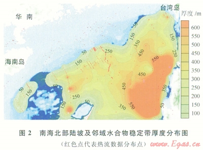 南海北部陸坡區(qū)水深變化范圍介于300~3500m之間,海底溫度介于1.45~9.00℃,而且與水深有很好的相關(guān)性。熱流分布較復(fù)雜(20~170mW/m2)。利用Miles[9]提出的海水中甲烷穩(wěn)定帶邊界曲線方程,以孔隙水鹽度為3.5%,氣體為純甲烷為約束條件,并根據(jù)熱流數(shù)據(jù)、熱導(dǎo)率、水深、海底溫度等參數(shù)進(jìn)行了穩(wěn)定帶厚度估算。計(jì)算結(jié)果表明,南海北部陸坡水合物穩(wěn)定帶厚度介于0~350m,在水深較大海盆區(qū)可超過500m(圖2),在水深小于500m的區(qū)域基本不具備形成水合物的條件。穩(wěn)定域厚度與水深變化呈正相關(guān)關(guān)系,而且水合物穩(wěn)定域受熱流變化驅(qū)動(dòng)明顯,穩(wěn)定域厚度的變化梯度與熱流值變化梯度有很大相關(guān)性,熱流值變小的地方穩(wěn)定域厚度變?nèi)耄守?fù)相關(guān)關(guān)系。