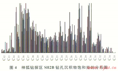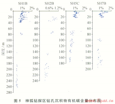 在南海北部陸坡淺表層沉積物有機(jī)質(zhì)中正構(gòu)烷烴基本為雙峰形,表現(xiàn)為海相浮游動(dòng)物、陸源高等植物混合母源特征。神狐鉆孑L沉積物有機(jī)質(zhì)正烷烴為雙峰形分布特征(圖4)。第一主峰碳數(shù)為C17~C19,代表海相浮游動(dòng)物和藻類,第二主峰碳數(shù)為C29或C31來源于陸源高等植物。其輕重?zé)N比值C21-/C22+介于0.06~5.73,有機(jī)質(zhì)d13C值為-17.3‰~-22.8‰,表明總體上以海相浮游動(dòng)物和藻類為主,局部存在陸源有機(jī)質(zhì)。鉆孔沉積物TOC介于0.29%~1.77%,各鉆孔頂部層段TOC明顯表現(xiàn)出在高值區(qū)振蕩變化特征,并隨深度的增加TOC值逐漸降低,而到一定深度后,TOC基本保持穩(wěn)定(圖5)。這種有機(jī)碳系統(tǒng)地向下減少是早期成巖階段有機(jī)質(zhì)氧化分解的結(jié)果[17]。由于鉆孔淺部沉積物埋藏時(shí)間短,有機(jī)質(zhì)消耗較少,TOC與沉積物中原始含量比較接近,平均值達(dá)1.2%;而下部層段的有機(jī)碳為經(jīng)過早期成巖階段硫酸鹽還原和微生物發(fā)酵而大量消耗后的穩(wěn)定殘留有機(jī)碳,有機(jī)碳轉(zhuǎn)化率在30%~61%,大多轉(zhuǎn)化為生物甲烷氣,是形成水合物的主要?dú)怏w來源。神狐鉆孔沉積物有機(jī)質(zhì)中含有豐富的烷基苯系列化合物,以短鏈的烷基苯同系物優(yōu)勢(shì)為特征,含少量對(duì)熱演化敏感的較長鏈的烷基苯同系物,表明有機(jī)質(zhì)熱演化程度很低。此外,部分樣品中存在重排甾烷和4-甲基甾烷,是典型的微生物作用活動(dòng)標(biāo)志,這與鉆探證實(shí)的水合物主要為微生物氣特征是一致的。