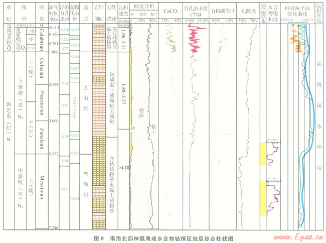 南海北部陸坡水合物主要富集在晚中新世以來的海相沉積物中,分布深度和層位深淺不一。通過對(duì)神狐鉆孔巖心分析,根據(jù)生物地層帶對(duì)比劃分標(biāo)準(zhǔn)[25],水合物層分布在NNl2-NNl6和NNll帶,分別對(duì)應(yīng)為上新統(tǒng)下部和上中新統(tǒng)(圖8)。從區(qū)域性沉積相分析,晚中新世以來南海北部陸坡區(qū)沉積演化具有明顯的繼承性,早期為濱海淺海深海的沉積環(huán)境,后期主要為半深海和深海沉積環(huán)境,陸坡沉積物總體巖性偏細(xì)。但是在臺(tái)西南盆地、珠江口盆地白云凹陷以及瓊東南盆地,局部發(fā)育了等深流、濁積扇、滑塌沉積、陸坡水道等沉積體系,由于沉積速率高、沉積物偏粗、有機(jī)碳含量較高,有利于水合物富集成藏(圖9)。