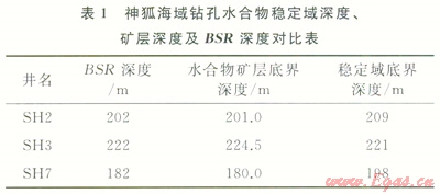 同樣,對(duì)神狐海域鉆探區(qū)穩(wěn)定域厚度進(jìn)行了計(jì)算,大量鉆探實(shí)測(cè)數(shù)據(jù)為穩(wěn)定域計(jì)算提供了準(zhǔn)確的參數(shù)。鉆探區(qū)熱流值為98.90~62.02mW/m2,在鉆探區(qū)內(nèi)8口先導(dǎo)孔均進(jìn)行了溫度測(cè)井和水深測(cè)量,在其中5個(gè)取心孔不同深度進(jìn)行了原位地層溫度測(cè)量,地溫梯度介于67.60~43.65℃/km。水合物甲烷含量超過99%,為I型水合物。計(jì)算結(jié)果表明,水合物穩(wěn)定域深度與BSR深度以及測(cè)井和取心揭示的水合物底界深度基本相符(表1)。鉆探區(qū)穩(wěn)定域厚度在80~224m,海底熱流變化對(duì)穩(wěn)定帶分布制約作用明顯,在SH2、SH3和SH7等3個(gè)井位附近,穩(wěn)定域厚度最大,也是熱流值最低的區(qū)域(66~75mW/m2)。