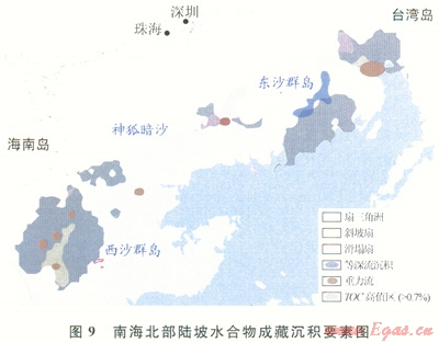 2)南海北部陸坡從西部 中部一東部體現(xiàn)出不同的地質(zhì)構(gòu)造特點(diǎn),其強(qiáng)烈差異性對(duì)水合物的富集成藏產(chǎn)生深刻的影響。東部以臺(tái)西南盆地北緣成藏條件最為優(yōu)越,水合物主要通過氣體的垂向與側(cè)向結(jié)合運(yùn)聚方式成藏,為復(fù)合型水合物發(fā)育的有利區(qū);中部以珠江口盆地白云凹陷南坡為代表,水合物主要通過氣體的側(cè)向運(yùn)聚模式成藏,驅(qū)動(dòng)力受淺層流體勢(shì)控制明顯,為分散型水合物發(fā)育區(qū);西南部以瓊東南盆地的深水帶成藏條件優(yōu)越,新近紀(jì)來構(gòu)造沉降速率較大,沉積厚度大,泥底辟和氣煙囪體發(fā)育,對(duì)水合物成藏控制明顯,水合物主要通過氣體的垂向運(yùn)聚模式成藏,有利于發(fā)育滲漏型水合物藏。