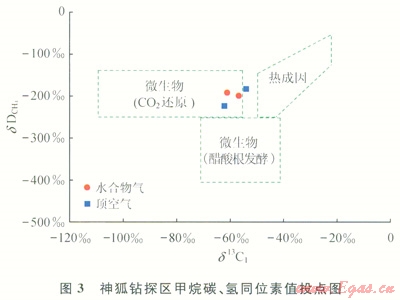 天然氣水合物氣體成因、來源及供給潛力是水合物成藏研究的最基本問題,它決定著水合物形成的物質(zhì)基礎(chǔ)及礦藏的資源潛力。深部的熱成因氣以及由水合物穩(wěn)定帶下部向上運(yùn)移的生物氣對(duì)于形成水合物是必需的[10],不同成因類型的烴類氣體具有不同的形成機(jī)理和運(yùn)聚方式,并影響水合物的成藏和分布。目前世界各地發(fā)現(xiàn)的水合物大多數(shù)由微生物氣生成,僅墨西哥灣、黑海、麥肯齊三角洲等地區(qū)的水合物是由熱解氣或混合氣生成的。因此,生物成因氣在水合物成藏研究中得到了較大的關(guān)注。由于頂空氣代表充填在沉積物孔隙或裂隙中的游離氣,與水合物礦藏氣體的成因關(guān)系密切,近年對(duì)南海北部陸坡大量淺表層沉積物(海底以下0~10m)中頂空氣的測(cè)試分析結(jié)果表明,頂空氣中的d13C1值介于-102.6‰~-24.0‰,平均值為-71.1‰,C1/(C2+C3)值介于6~84659,dD值介于-180‰~145‰,研究表明氣體來源具有多源性,而且在不同區(qū)域有所差別。東沙海域頂空氣的d13C1值為-102.6‰~-38.2‰,平均值為-78.5‰,是以微生物氣為主的混合氣;西沙海域頂空氣d13C1值為-94.2‰~-71.4‰,平均值為-85.5‰,為微生物氣。從神狐鉆探區(qū)情況看,水合物樣品中的烴類氣體以甲烷為主,甲烷含量高達(dá)99.89%和99.91%,C1/(C2+C3)值分別為911.7和1094,d13C1值為-56.7‰和-60.9‰,dD值為-199﹪和-180‰;2個(gè)頂空氣樣品的甲烷含量分別達(dá)99.92%和99.96%,C1/(C2+C1)值分別為1373.5和2447,d13C1值為-62.2‰和-54.1‰,dD值為-225‰和-191‰。神狐鉆探區(qū)呈現(xiàn)以微生物氣為主的混合氣特征[11-12],根據(jù)甲烷碳、氫同位素特征分析,主要為C0。還原型甲烷(圖3),水合物具有自生自儲(chǔ)原地附近運(yùn)聚的成藏特征[13]。