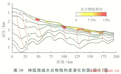 模擬結(jié)果表明,在臺(tái)西南盆地水合物主要分布在水深1200~2800m的區(qū)域,海底以下100~400m層段是水合物最富集區(qū)間,飽和度普遍超過6%,水合物呈厚層狀或團(tuán)塊狀展布,局部可超過5%。白云凹陷現(xiàn)今水合物主要分布在水深1000~3200m海域,成帶狀分布富集,斷層控制了水合物的展布[28],一些在第四系中仍然發(fā)育的斷層,其中水合物的飽和度較高,平均含量可超過15%。瓊東南海域水合物主要分布在水深1100~1600m,呈帶狀富集分布,水合物普遍分布較淺,層薄而飽和度不高,厚度最大在100m左右,局部平均含量可超過10%(圖10)。
