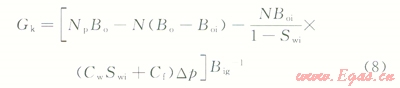 2)地面的累積產(chǎn)氣量為Gp,Gp=NpRp,Rp為累積生產(chǎn)氣油比。而在p壓力下累積產(chǎn)油量Np的溶解氣量為NpRs,Rs為p壓力下的溶解氣油比。因此,地層壓力由pi下降到p時,由油藏中多產(chǎn)出的天然氣地下體積量為Np(Rp-Rs)Bg,Bg為p壓力下的天然氣體積系數(shù)。