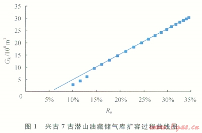 根據(jù)上述方法,計算了興古7古潛山油藏在氣驅(qū)開發(fā)過程中,油層中部深度地層壓力保持在27.25MPa下的原油不同采出程度(Ro)時所對應(yīng)的地下儲氣庫庫容量,當(dāng)油藏達(dá)到最終采收率為34.48%、地層壓力為30MPa時,地下儲氣庫的庫容量為30.52×108m3(圖1)。