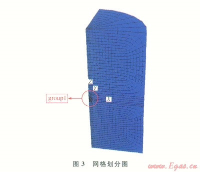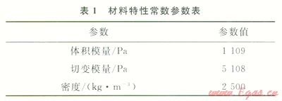 圖3中,1/4圓柱體模擬儲(chǔ)氣庫(kù)溶腔周?chē)牡刭|(zhì)環(huán)境,其直徑是儲(chǔ)氣庫(kù)溶腔模型最大直徑的20倍,在網(wǎng)格中間位置可以看到儲(chǔ)氣庫(kù)溶腔輪廓的1/4。在網(wǎng)格劃分時(shí)將儲(chǔ)氣庫(kù)溶腔網(wǎng)格一起劃分,有助于儲(chǔ)氣庫(kù)溶腔的形成。在此網(wǎng)格中,定義了2個(gè)組,分別是group1和group2,前者對(duì)儲(chǔ)氣庫(kù)溶腔進(jìn)行網(wǎng)格劃分,后者對(duì)儲(chǔ)氣庫(kù)溶腔周?chē)刭|(zhì)環(huán)境進(jìn)行網(wǎng)格劃分。選擇采用各向同性彈性模型,其材料特性常數(shù)見(jiàn)表1。