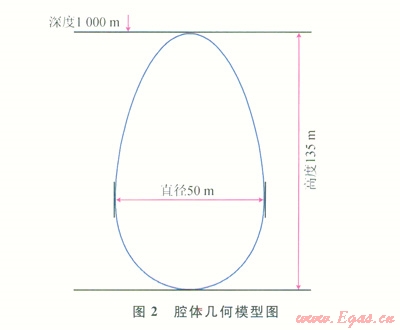 我國(guó)鹽巖礦藏以多夾層鹽巖為主,由于主要分析鹽穴儲(chǔ)氣庫(kù)溶腔在鹽巖蠕變下的變形規(guī)律,因此在建立儲(chǔ)氣庫(kù)溶腔模型時(shí)將復(fù)雜的鹽巖夾層簡(jiǎn)化為簡(jiǎn)單的單層鹽巖層。借鑒江蘇金壇鹽穴儲(chǔ)氣庫(kù)的建庫(kù)參數(shù)[4],建立了如圖2所示的腔體幾何模型。建立溶腔及圍巖地層模型后,將地層巖石力學(xué)參數(shù)、鹽層的蠕變關(guān)系、溶腔周?chē)牡貞?yīng)力參數(shù)及溶腔運(yùn)行參數(shù)帶入模型中進(jìn)行模擬計(jì)算。