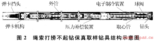 張永勤等[21]承擔(dān)的“十五”國家高技術(shù)研究發(fā)展計劃項目“深水深孔天然氣水合物保真取樣鉆具的研制”,分別研制了繩索打撈不起鉆保真取樣鉆具和投球起鉆式保壓取樣鉆具:①繩索打撈不起鉆取樣鉆具系統(tǒng)(圖2)主要由內(nèi)管總成、外管總成、鉆桿、打撈裝置、繩索絞車等組成,不起鉆可實現(xiàn)連續(xù)取心作業(yè)。齒條齒輪機(jī)構(gòu)使球閥旋轉(zhuǎn)90°,密封巖心容管。為了更可靠地保持水合物的原始狀態(tài),在鉆具結(jié)構(gòu)上設(shè)有蓄能壓力補(bǔ)償裝置。電子制冷裝置由保溫層和電子制冷器組成,保持樣品的溫度。繩索打撈不起鉆取樣技術(shù)具有勞動強(qiáng)度低、效率高、輔助肘間少等優(yōu)點(diǎn),主要技術(shù)參數(shù)為:鉆孔直徑為174~190mm;巖心直徑為30~40mm;單次取心長度為3m。②投球起鉆式保壓取樣鉆具可直接連接到現(xiàn)有的石油鉆井鉆桿上進(jìn)行鉆進(jìn)取樣,但取樣時必須起出孔內(nèi)的全部鉆桿及鉆具,球閥關(guān)閉時采用泥漿作為動力介質(zhì),該鉆具與現(xiàn)有海洋石油鉆機(jī)配套鉆井施工時無需進(jìn)行任何設(shè)備改造,利用現(xiàn)有的Ф114mm、Ф127mm、Ф140mm鉆桿即可鉆井施工。